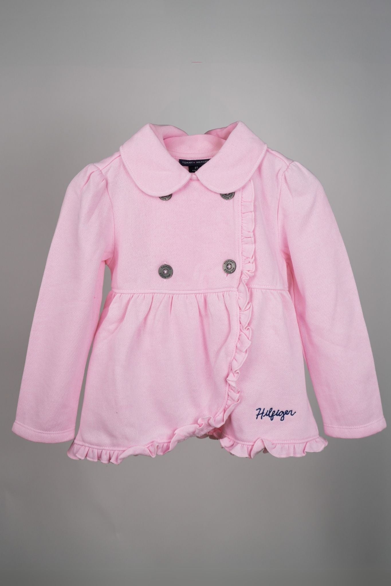 Embrace timeless elegance with Tommy Hilfiger’s Pink Frill Coat Set, designed to offer warmth without sacrificing style, complete with navy leggings for a contrasting chic.